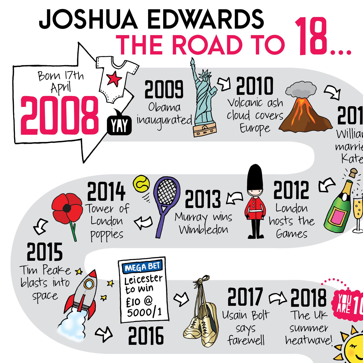 This fab 18th birthday print 'the Road to 18' is the perfect personalised gift for your son, daughter, boyfriend, girlfriend or family member to celebrate their 18th birthday from 2008.