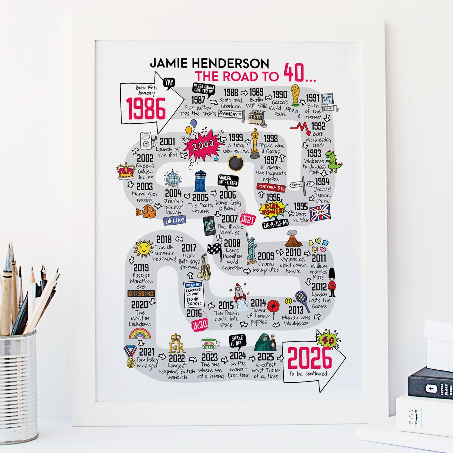 Turning 40 is a remarkable milestone, and this personalised Road to 40 print is a beautiful tribute to the adventures and joyous moments that have paved the way since 1986.