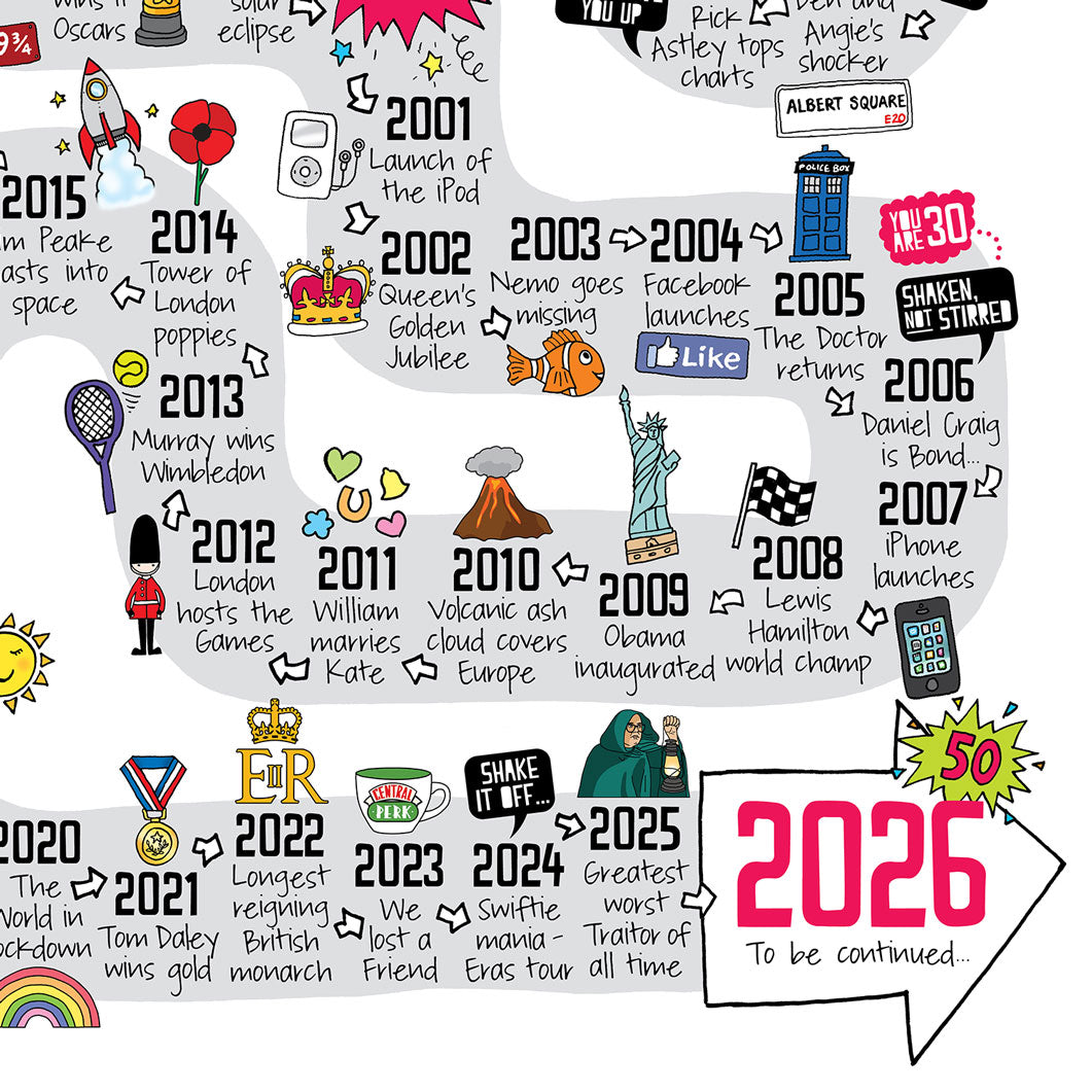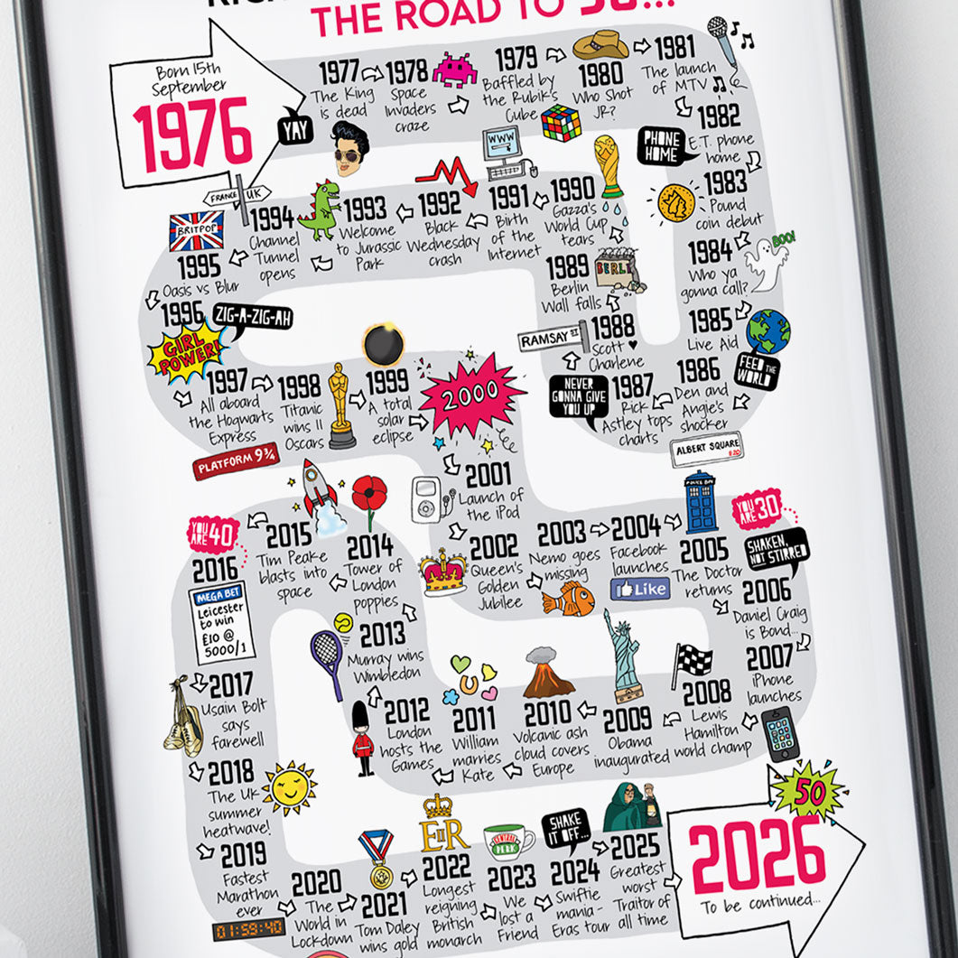 The 'Road to 50' personalised 50th birthday print celebrates 50 years of popular culture, from the Rubik's cube, to the fall of the Berlin Wall, to Britpop and beyond. Each illustration helps to capture a moment in time and will bring back a few memories as they look back over the last 50 years.