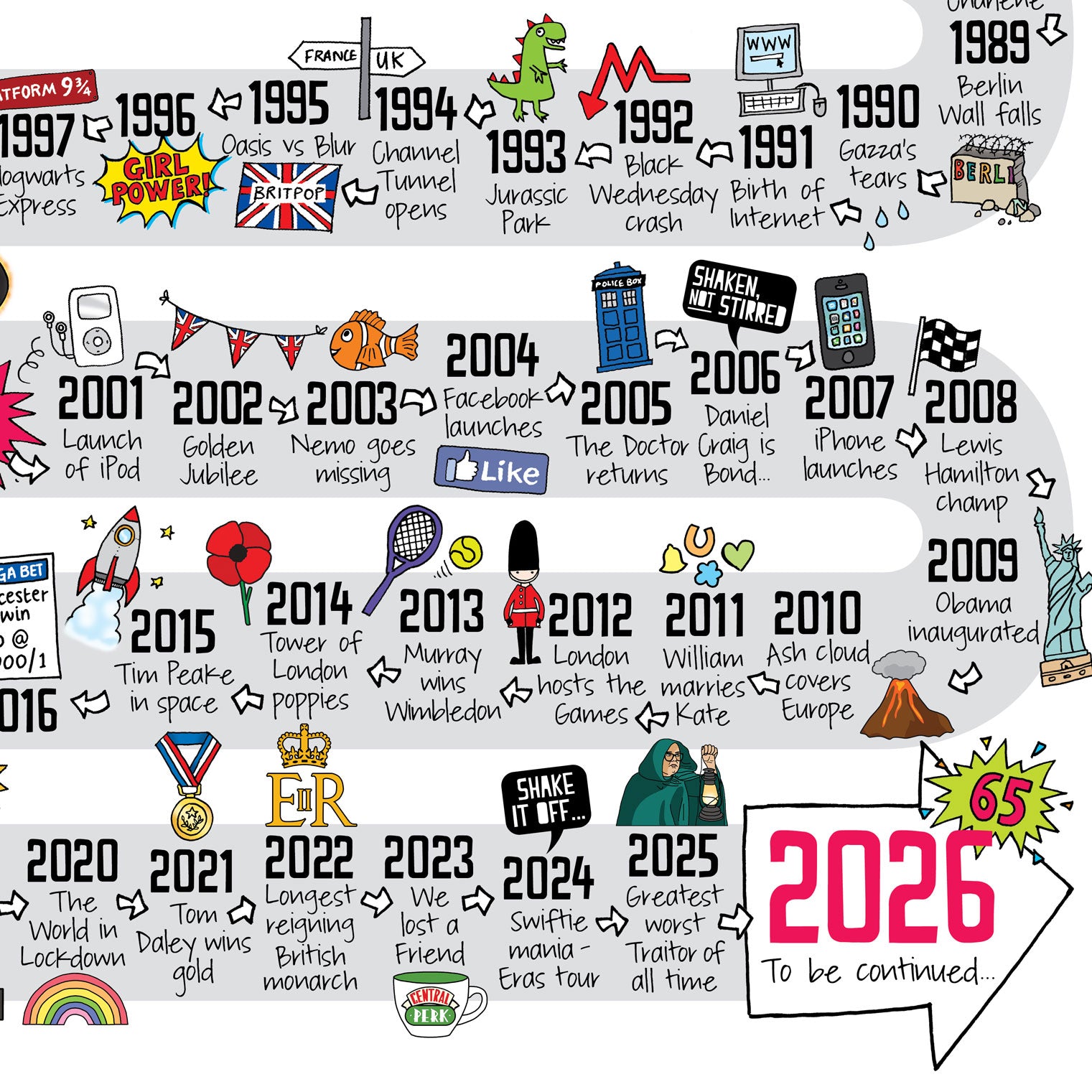 A timeline of events from 1961 to celebrate a 65th birthday.