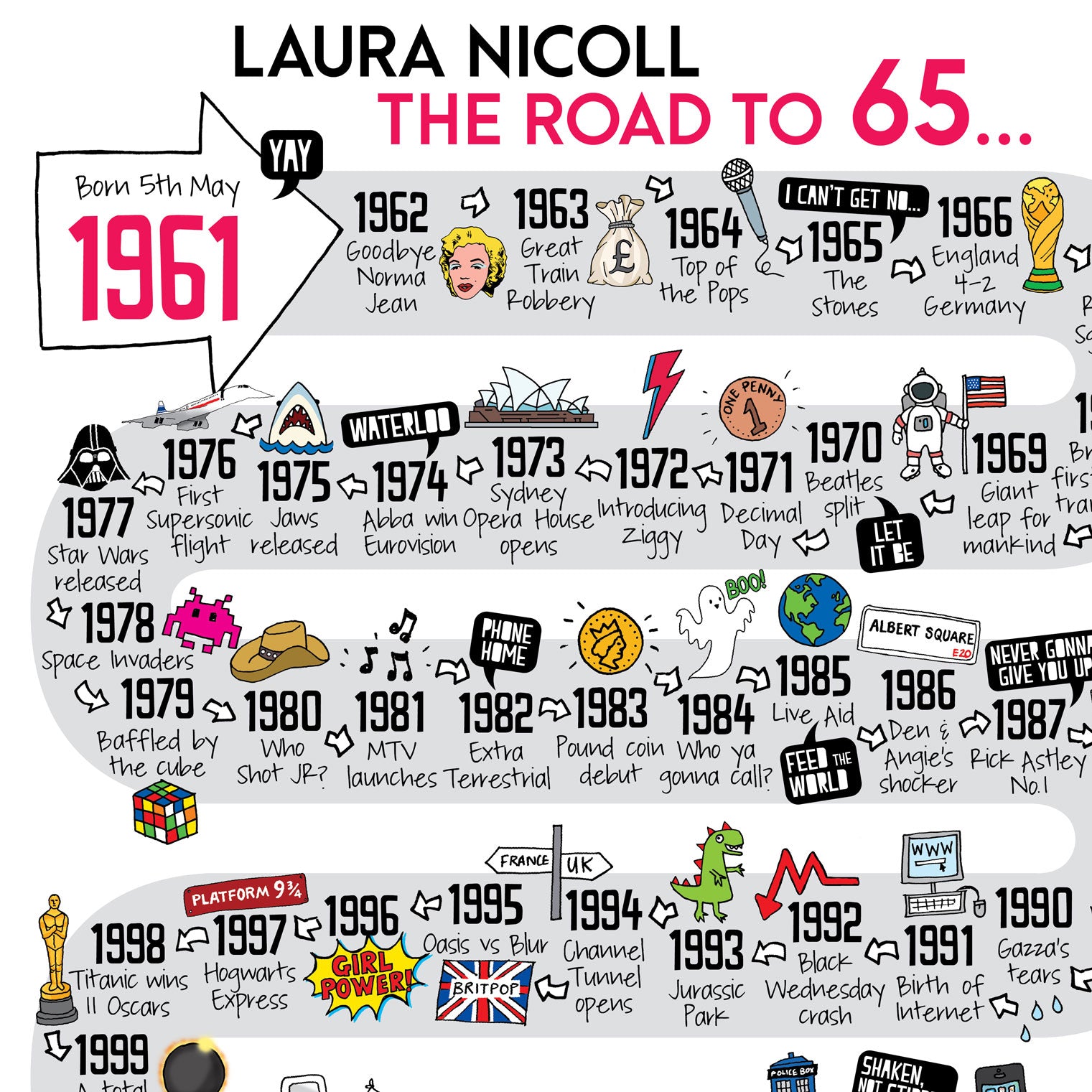 Celebrate a 65th birthday with our Road to 65 print. This personalised print is the perfect way to capture 65 years of memories and is a lovely present for a parent, grandparent or family member.