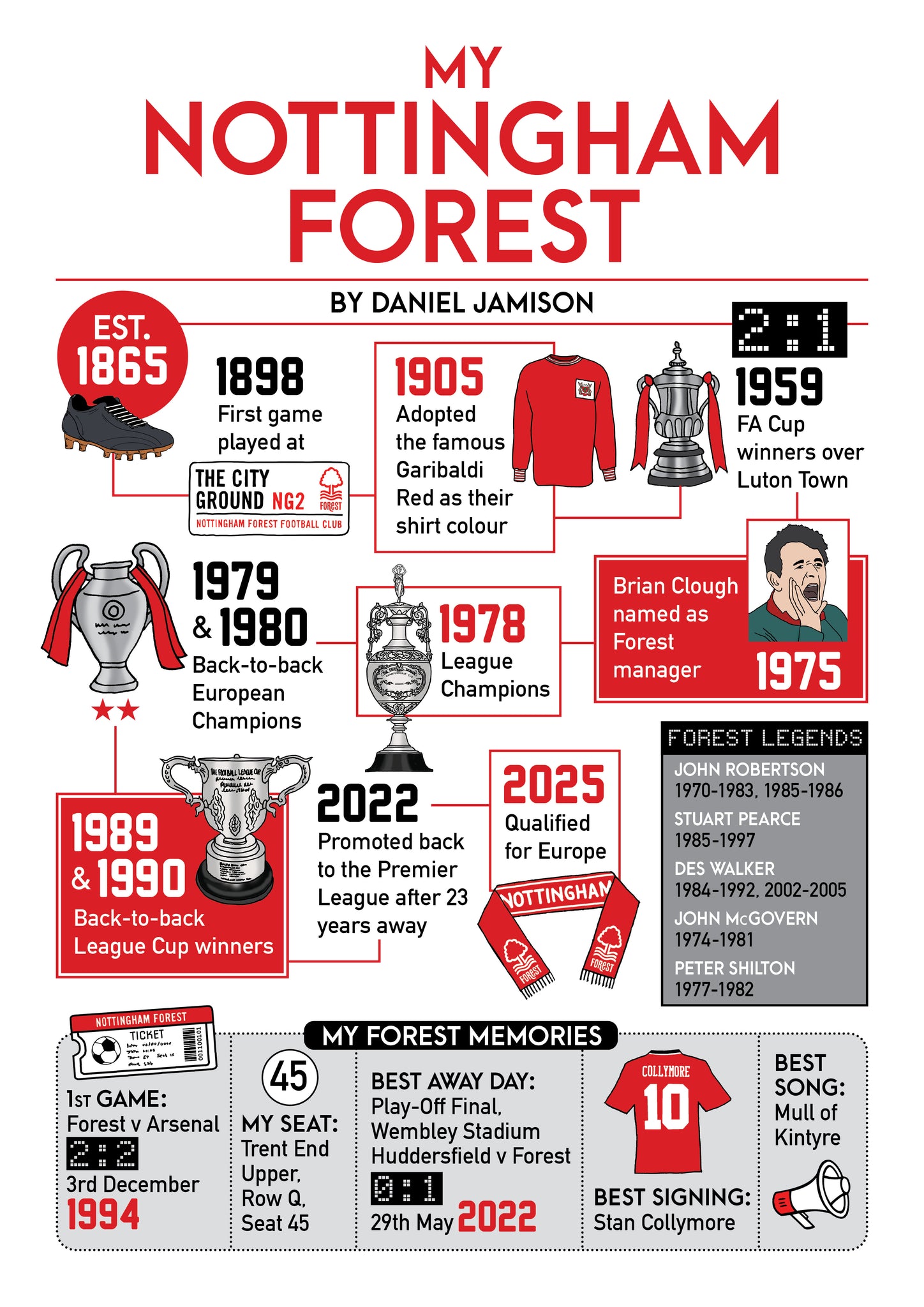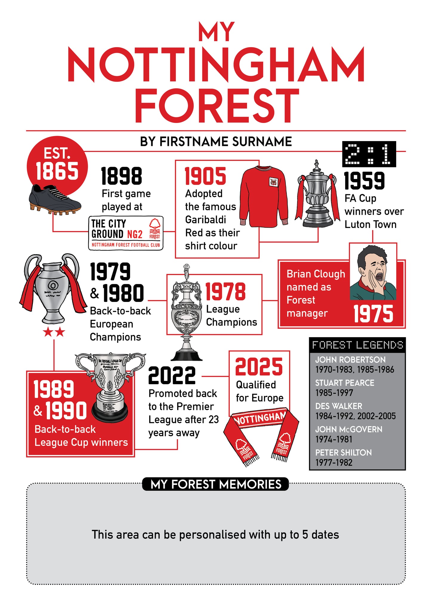 This personalised print features historic moments, key milestones and achievements from Nottingham Forest's history from 1865 to the present day.
